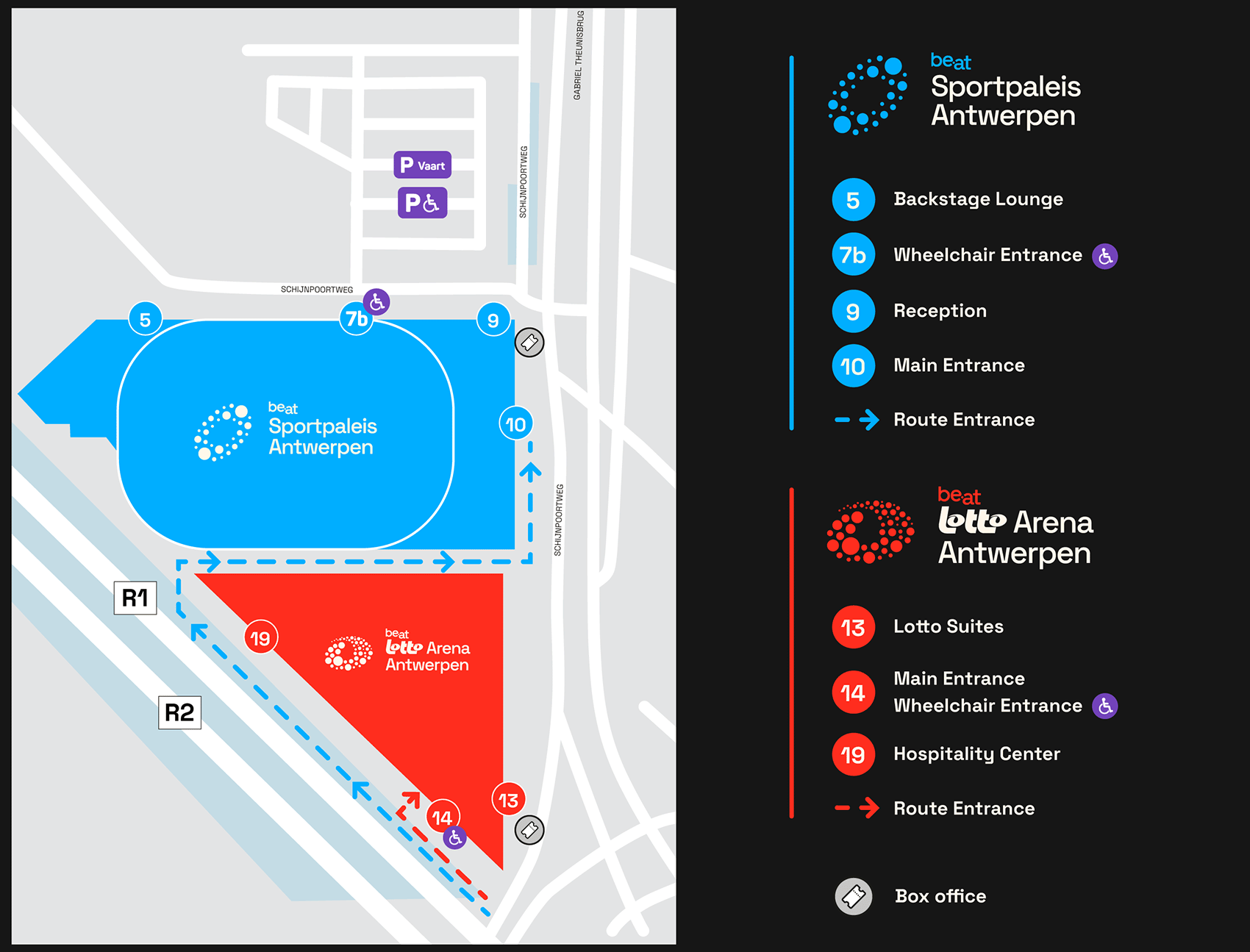 - De Box Office van Lotto Arena & AFAS Dome kan je terugvinden op onderstaand situatieplan, aangeduid met 'Box Office'.